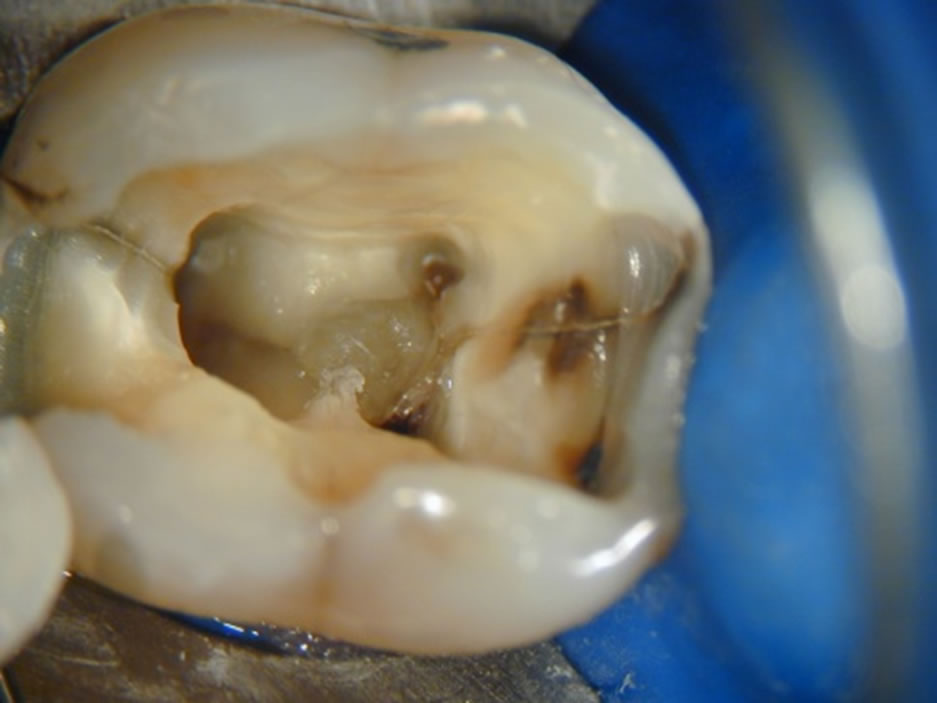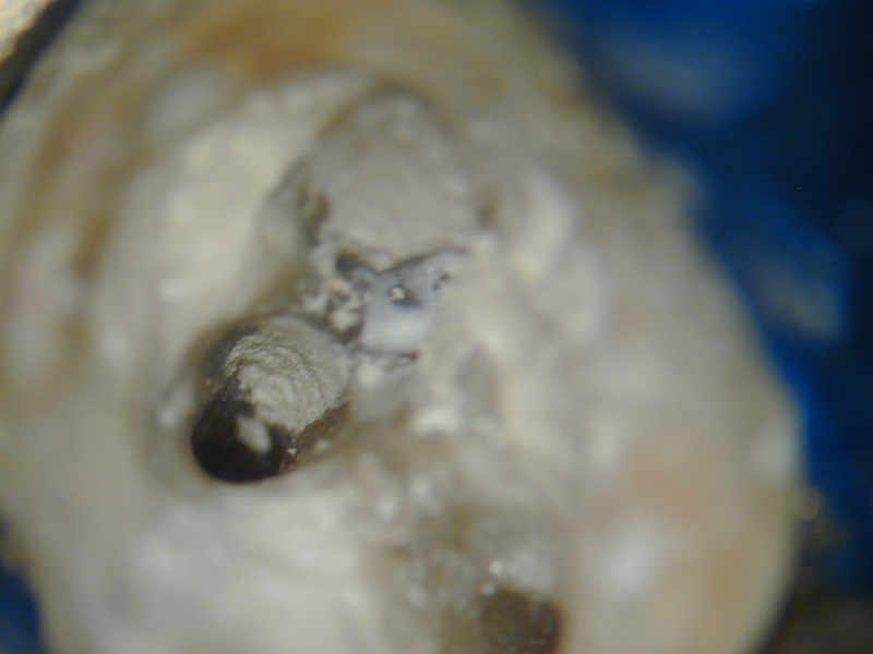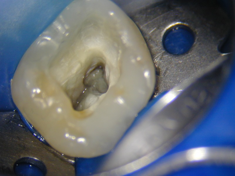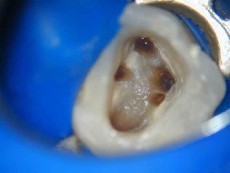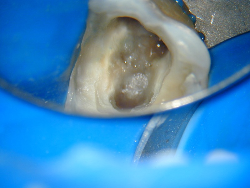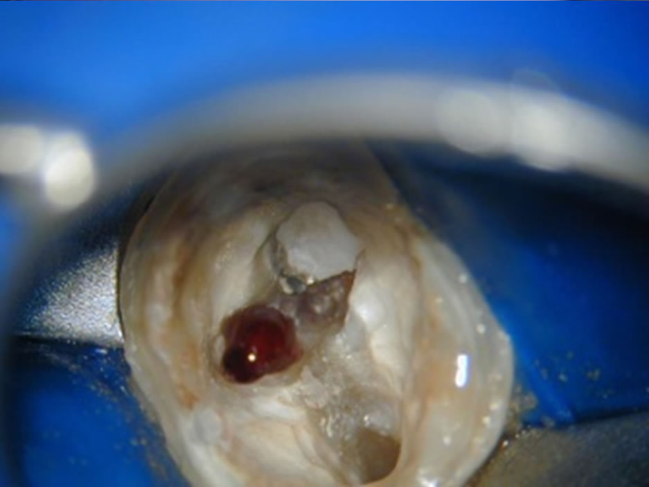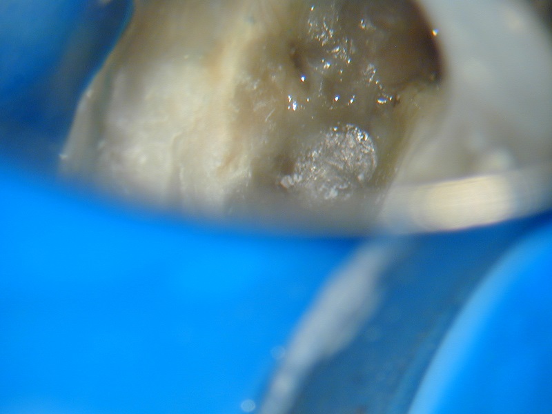 Foto da câmara pulpar com nódulos impedindo a entrada e acesso ao canal radicular.